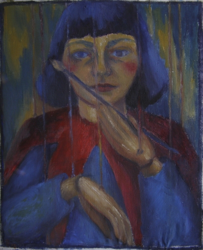 Selbstbildnis als Marionette - Ölmalerei auf Stoff - 25 x 31 cm - 1978