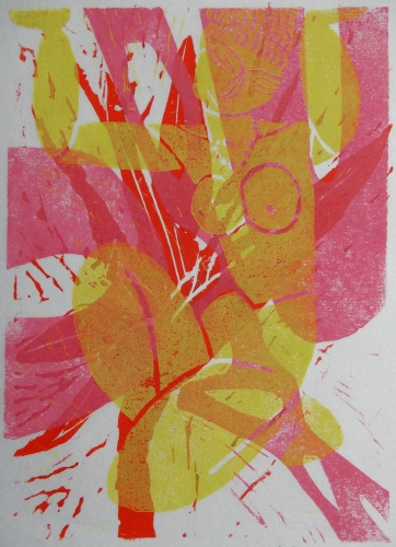 Es sollte eine Gruppenarbeit werden, bei der 3 bis 4 Linolschnitte übereinander gedruckt ein neues Bild ergeben.
